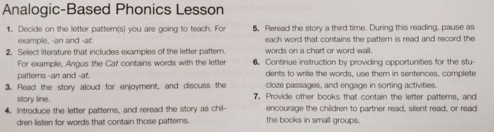 Analogy–Based Instruction – Students are taught to recognize onsets and rimes as they learn to decode unfamiliar words. This instruction strategy also believes that children learn to read words in context and “chunking words” by letter patterns ins what good readers do. In regard to using this strategy for teaching phonics, teachers teach and demonstrate that words with similar onset and rime patterns have similar pronunciations, use known word/s to compare patterns and break a word into chunks (meadow = m, ead, ow), and make words using letter patterns. Below is an example of a step-by-step analogic-based phonics lesson: